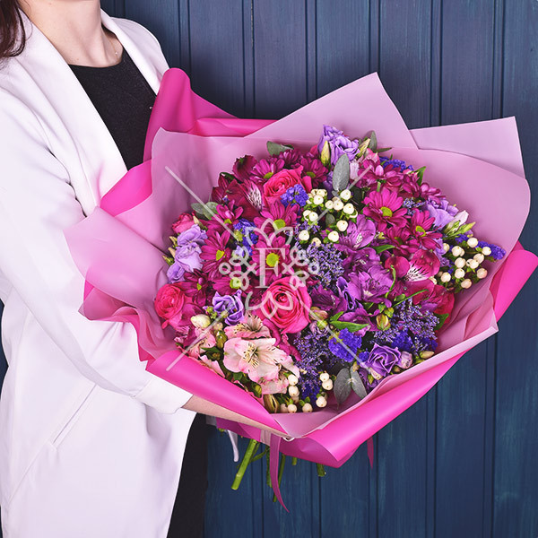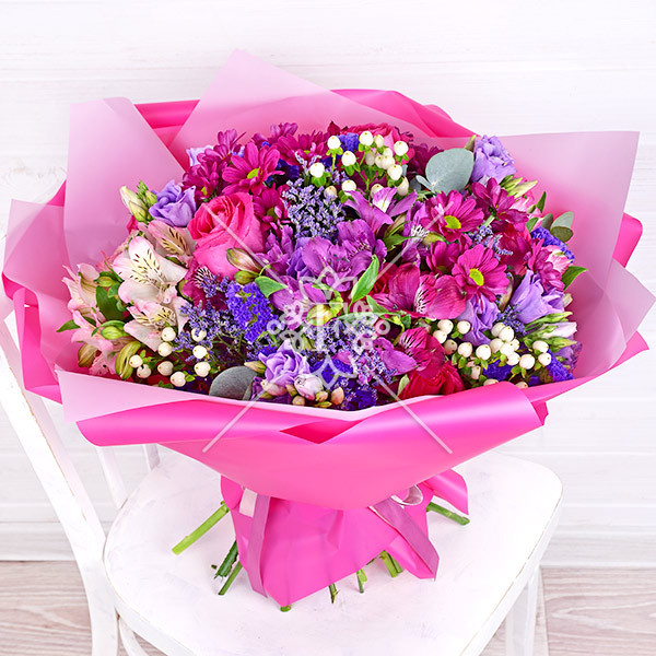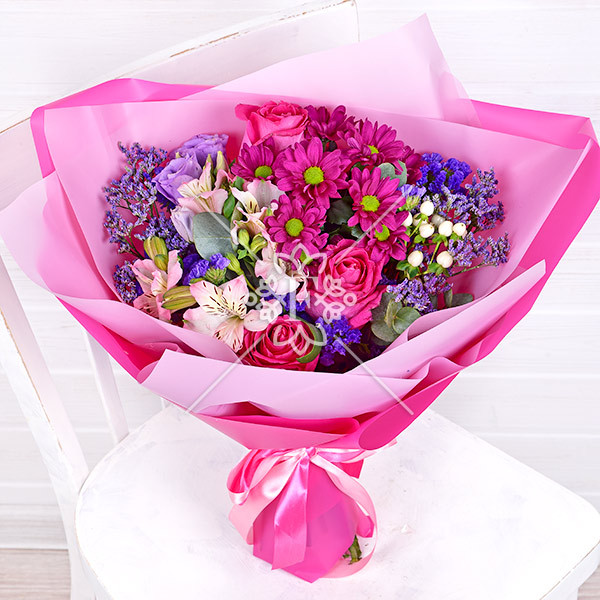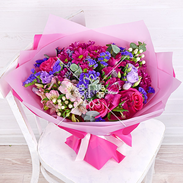 роза розовая –  3 шт., эустома фиолетовая –2  шт., хризантема кустовая фиолетовая – 1  шт., альстромерия фиолетовая, розовая  – 1 шт., гиперикум белый – 1 шт., статица фиолетовая – 1 шт., зелень декоративная (лимониум фиолетовый, эвкалипт) упаковка, лента.